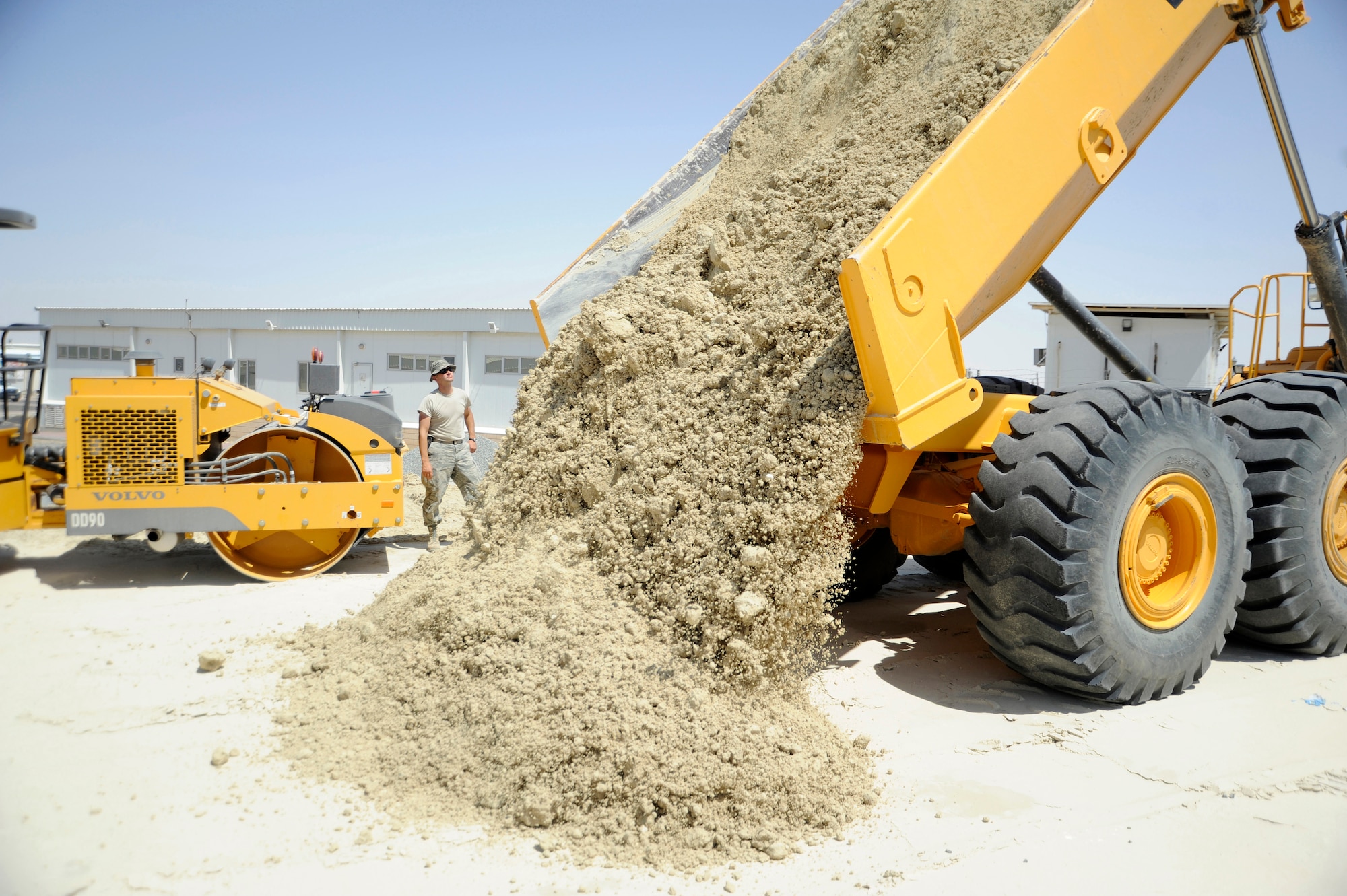 Tech. Sgt. Mark Ondersma, 386th Expeditionary Civil Engineer Squadron, heavy equipment operator, watches as Tech. Sgt. Phillip Biwer, 386th ECES, heavy equipment operator, operates a Volvo 30-ton dump truck here, July 24, 2013. Ondersma directs Biwer where to dump the gatch at the future site of a new building. Gatch is a sand and gypsum mix used under all buildings here; it is the equivalent to quick concrete. Ondersma, a native of Hudsonville, Mich. is deployed out of the 110th Airlift Wing, Battle Creek, Mich., Air National Guard unit. Biwer, a native of Plainfield Ill. is deployed out of the 110th Airlift Wing, Battle Creek, Mich., Air National Guard unit. (U.S. Air Force photo by Master Sgt. Christopher A. Campbell)