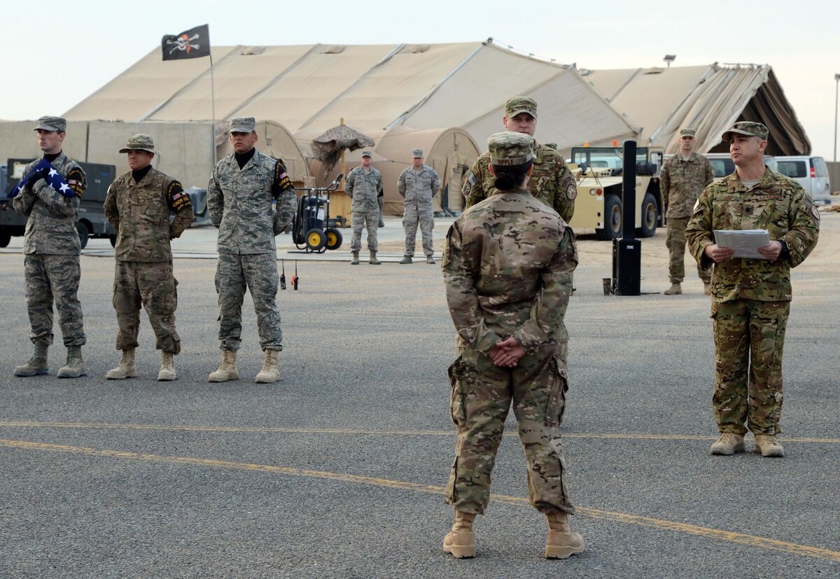 SOUTHWEST ASIA - Airmen from the 386th Air Expeiditionary Wing Honor Guard perform a flag folding ceremony during a memorial for the crew of Spirit 03 here Jan. 31, 2015. All 14 crew members were killed when Spirit 03 was shot down on Jan. 31, 1991.