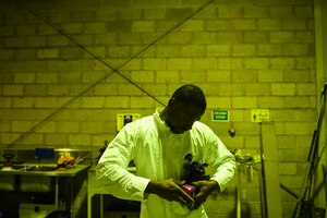 Oct. 15, 2019 Joint-base pest control manage insect population Senior Airman Ibukunoluwa Adaba, 386th Expeditionary Civil Engineer Squadron pest manager, dons equipment before heading to a spray site at Ali Al Salem Air Base, Kuwait, Oct. 3, 2019. Twice a year, pest control specialists from the 386th ECES and 407th Expeditionary Support Squadron combine forces