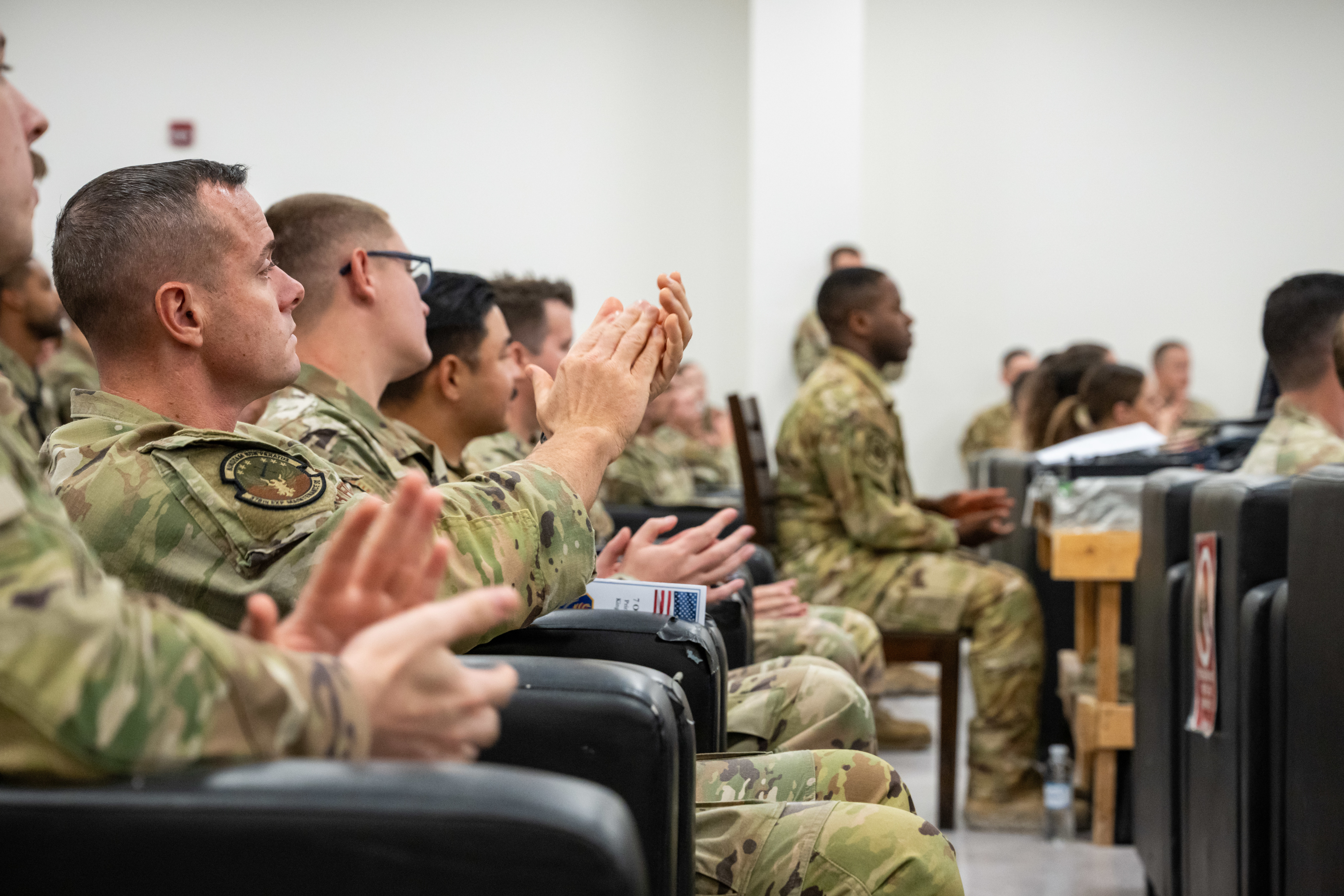 U.S. Air Force Airmen applaud during the 378th Air Expeditionary Wing change of command ceremony in the U.S. Air Force Central Command area of responsibility, Oct. 7, 2025. The change of command ceremony is a military tradition providing Airmen an opportunity to witness the transfer of leadership. (U.S. Air Force photo by Senior Airman Tyler A. P. Moody)