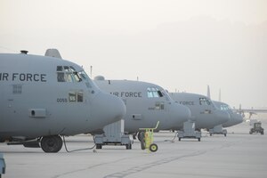 C-130 Hercules aircraft assigned to the 774th Expeditionary Airlift Squadron sit on the ramp at Bagram Airfield, Afghanistan prior to an afternoon mission July 19, 2011. C-130s perform a variety of missions here including strategic airlift, aeromedical evacuation and personnel transport. (U.S. Air