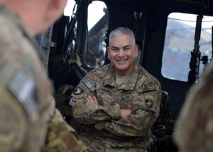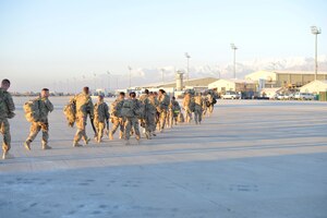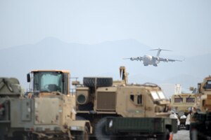 A C-17 Globemaster III descends for landing at Bagram Airfield, Afghanistan Nov. 2, 2014. The men and women of Bagram Airfield service the Department of Defense’s busiest single runway. Airmen and civilian contractors work 24 hours a day, seven days a week to ensure airfield operations are