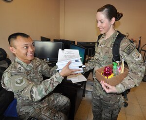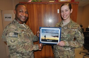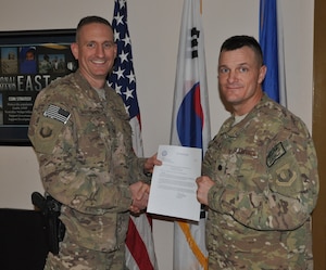 Lt. Col. Seth Frank, 755th Expeditionary Security Forces Squadron commander, was presented a congratulatory memorandum from U.S. Air Force Gen. C. Robert Kehler, U.S. Strategic Command commander, here via Col. Glen Christensen, 455th Expeditionary Base Defense Group commander, deployed from Joint