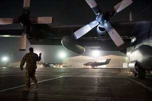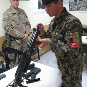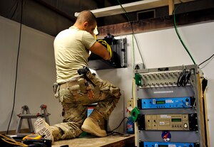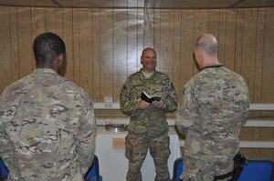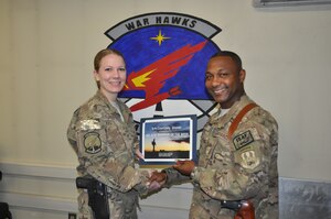 Chief Master Sgt. Kenneth Lindsey, Command Chief Master Sergeant of the 455th Air Expeditionary Wing, presents the "Warrior of the Week" award to Tech. Sgt. Steven Greenleaf, 455th Expeditionary Civil Engineer Squadron engineering assistance, on Bagram Airfield, Afghanistan, Oct. 2, 2013. Greenleaf,