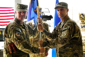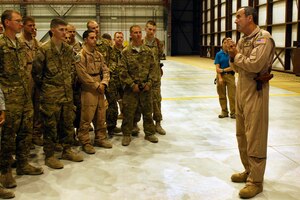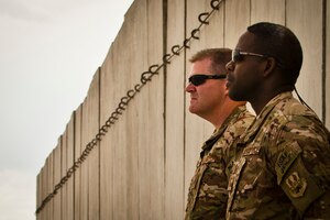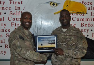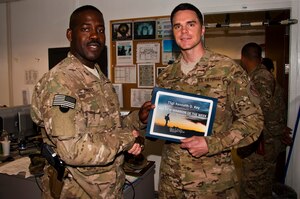 CMSgt. Marcus Snoddy, 455th Air Expeditionary Wing command chief, presents the Warrior of the Week award to TSgt. Kenneth Key, NCOIC of 455th Medical Information Systems at Bagram Airfield, Afghanistan, June 19, 2012. Key leads the IT help desk for the Craig Joint Theater Hospital, the most