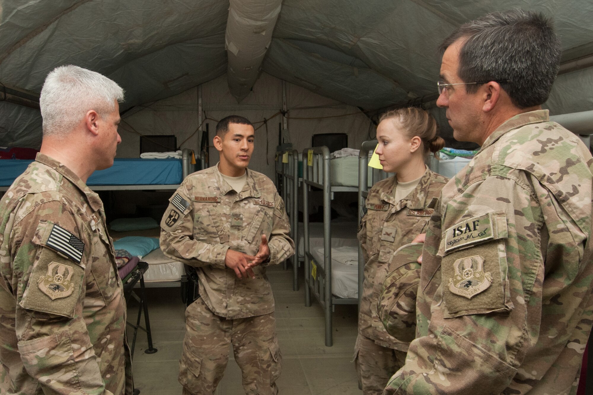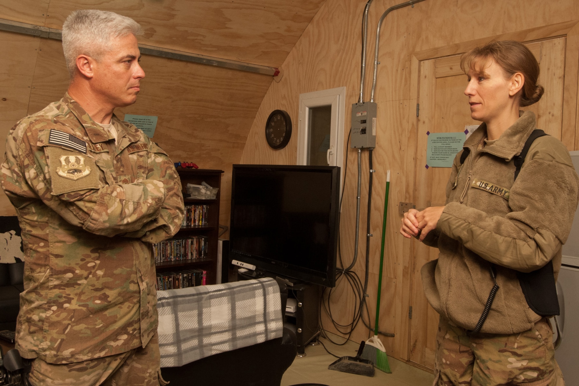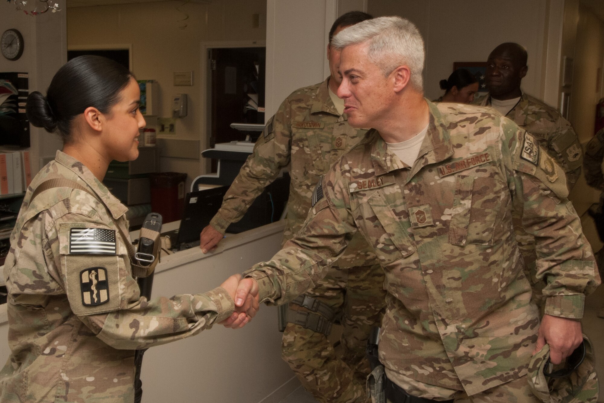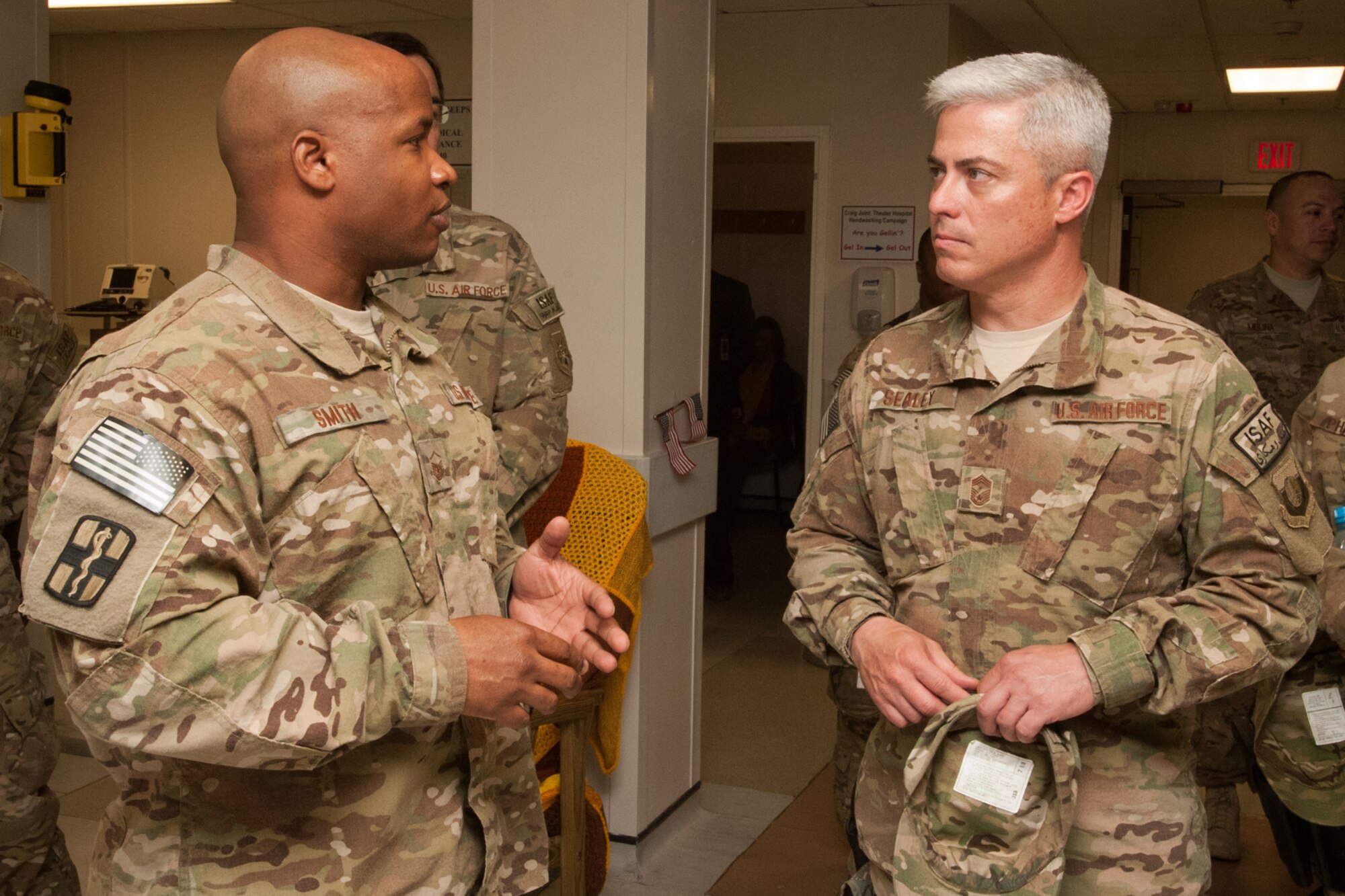 Master Sgt. Jermain Smith (left), Intensive Care Unit superintendent at the Craig Joint Theater Hospital, speaks about specific ICU capabilities with Chief Master Sgt. Robert Sealey, U.S. Air Force Central Command command chief, during Sealey’s visit to Bagram Airfield, Afghanistan, Oct. 24, 2012. Smith discussed various responsibilities of ICU nurses and medical technicians at the hospital. (U.S. Air Force photo/Staff Sgt. Jeff Nevison)