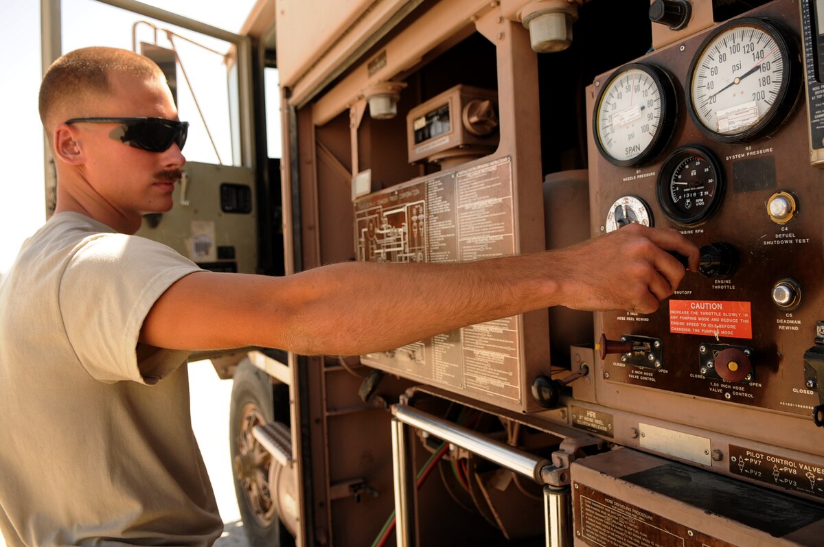 BAGRAM AIRFIELD, Afghanistan -- Airman 1st Class Kailyne Jones, 455th Expeditionary Logistics Readiness Squadron, fuels distribution operator, fuels a MC-12 Liberty aircraft here July 2. Airman Jones arrived here in February and rapidly established himself as a top performer, helping to safely issue 48 million gallons of fuel to more than 15,000 coalition aircraft. The hard-charging Airman has set numerous fuels records during his time here. To date, he has personally pumped more than 3 million gallons of fuel on more than 2,000 fuel runs, with an average response time of 10 minutes. (U.S. Air Force photo by Senior Airman Krista Rose.)