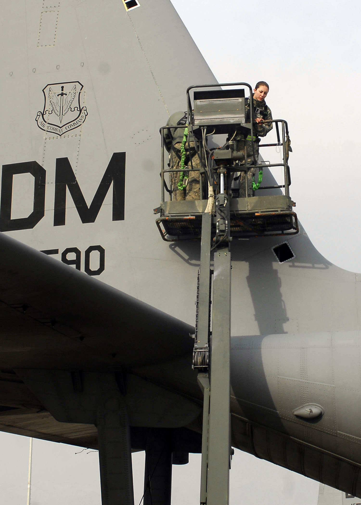 BAGRAM AIRFIELD, Afghanistan -- Tech. Sgt. Lee Fortner removes screws from a panel on the EC-130 Compass Call so the aircraft can be inspected, while Airman First Class Sarah Garrett moves the lift when needed, Dec. 3, 2009. These inspections are important because the EC-130?s primary mission is to support tactical air operations. Both Airmen are from the 41st Expeditionary Electronic Combat Squadron deployed from Davis-Monthan Air Force Base, Ariz. Sergeant Fortner, a crew chief, hails from Las Vegas. Airman Garrett, an electronic warfare specialist, hails from Alamogordo, N.M. (U.S. Air Force photo/Senior Airman Felicia Juenke)