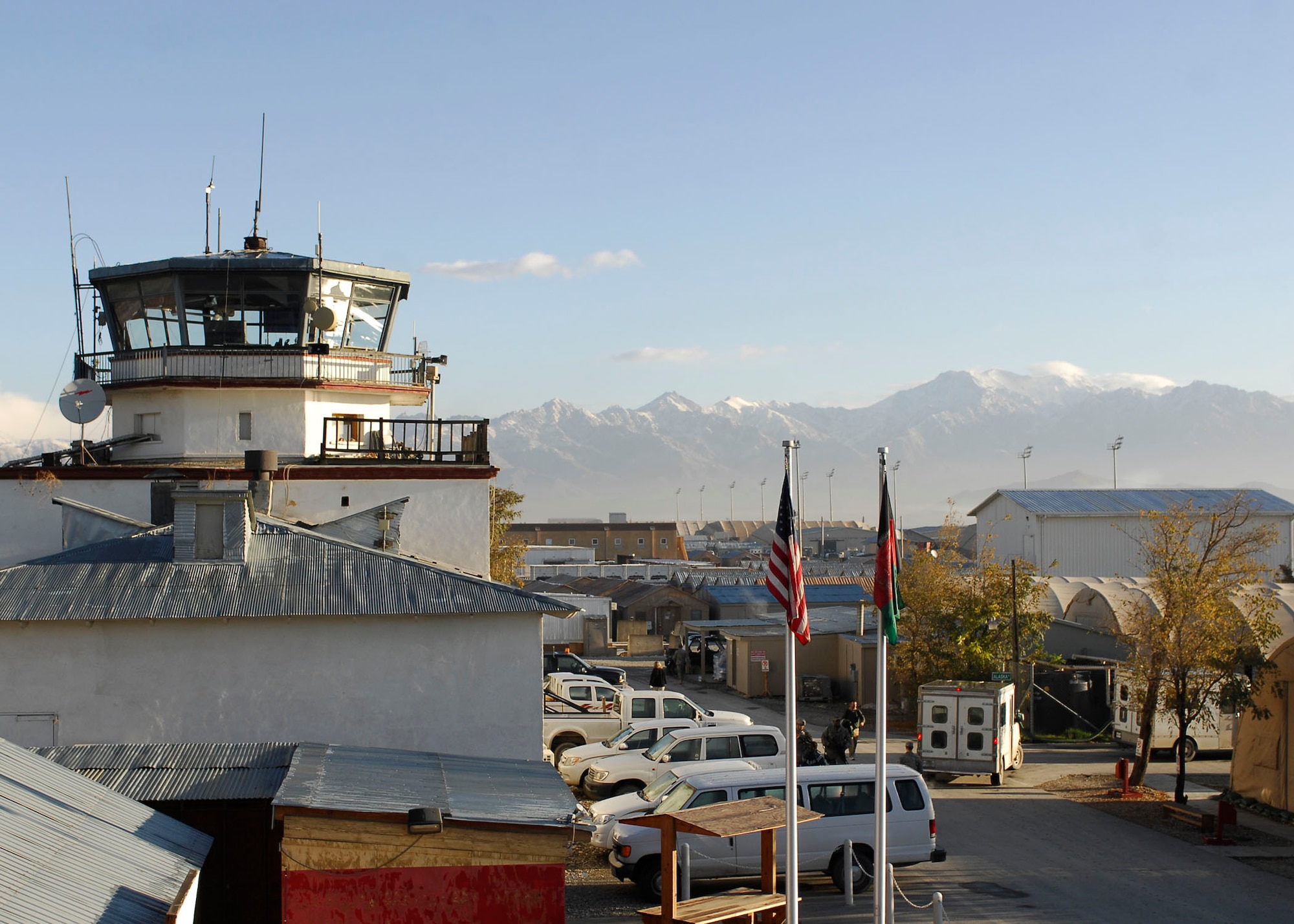 BAGRAM AIRFIELD, Afghanistan -- Beautiful mountains in Afghanistan are visible behind the old Russian Control Tower, known as the Crow?s Nest, Nov. 9, 2009. The Russian Control Tower was built in 1976 during the Soviet Union's occupation of the region. Currently more than 5,000 Airmen are deployed to Bagram supporting Operation Enduring Freedom and NATO International Security Assistance Forces. (U.S. Air Force photo/Senior Airman Felicia Juenke)