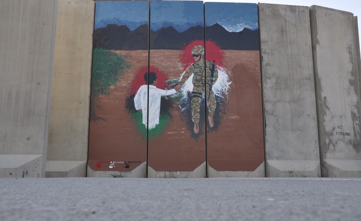 Airman 1st Class Eli Hixson, 455th Expeditionary Aerial Port Squadron air transportation passenger service agent, assists during a mural painting that depicts the bonds, unity, respect, trust, strength and the will to protect on the walls on Bagram Airfield, Afghanistan, Aug. 30, 2013. “This mural was intended to signify our growing efforts to help the Afghan military and government obtain the necessary fundamentals to begin their process in bringing not only their own country together, but to bring the U.S. and Afghanistan nations together,” said Hixson, deployed from McGuire-Dix-Lake, N.J., and is a native of Laramie, Wyo. “It is also a symbol of what our fallen Soldiers, Airmen, Sailors and Marines have sacrificed and fought for in hopes that with our efforts, another nation can learn and become one with itself.” (U.S. Air Force photo/Tech. Sgt. Rob Hazelett)