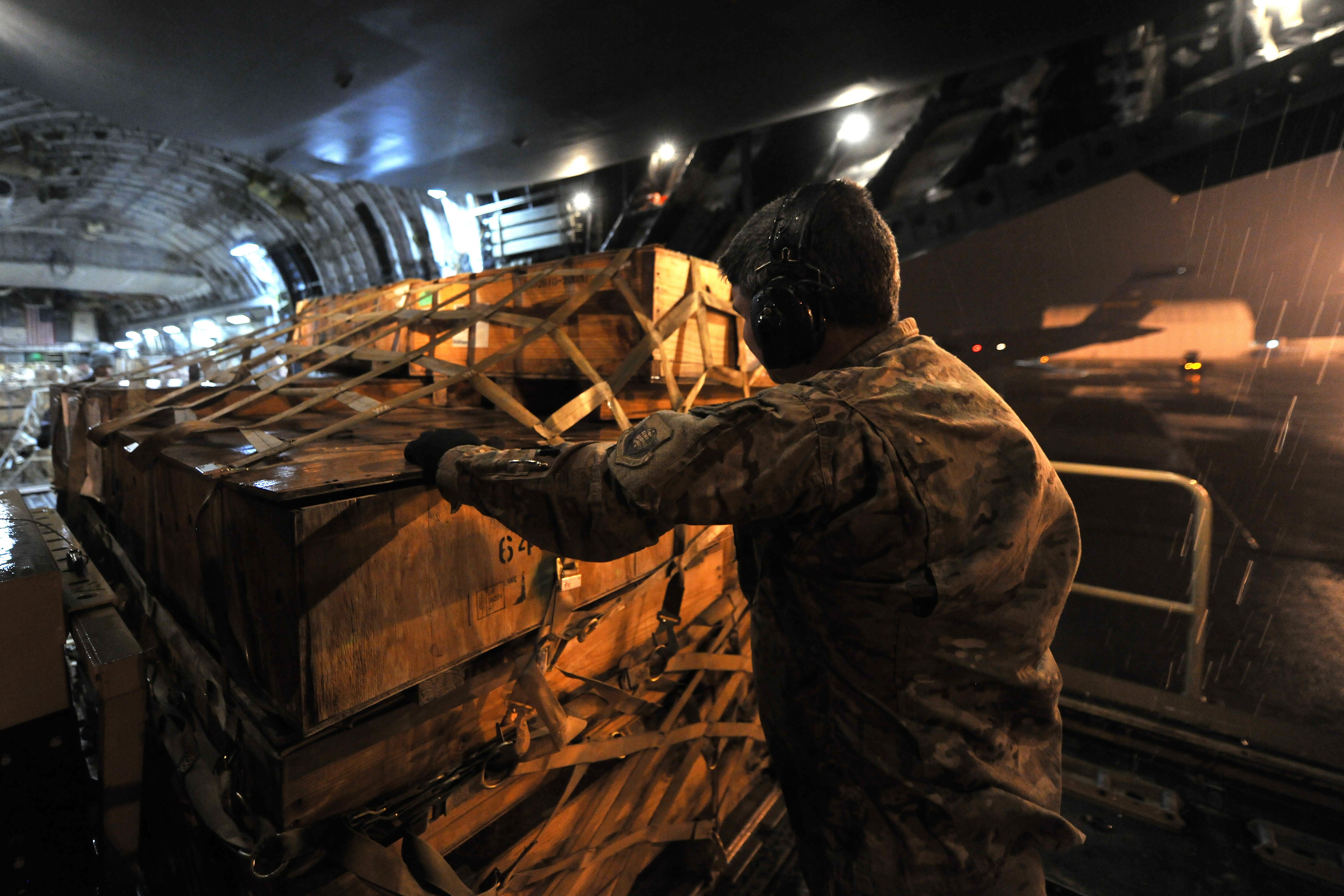 Master Sgt. Joel Graham, 455th Expeditionary Aerial Port Squadron, Detachment 3 chief, loads pallets onto a C-17 Globemaster III at Camp Marmal, Afghanistan, Jan 30, 2013. Airmen from the 455th EAPS are forward deployed from Bagram Airfield, Afghanistan, to support the main Air Force contingency cargo staging yard in Regional Command-North. (U.S. Air Force photo/Senior Airman Chris Willis)