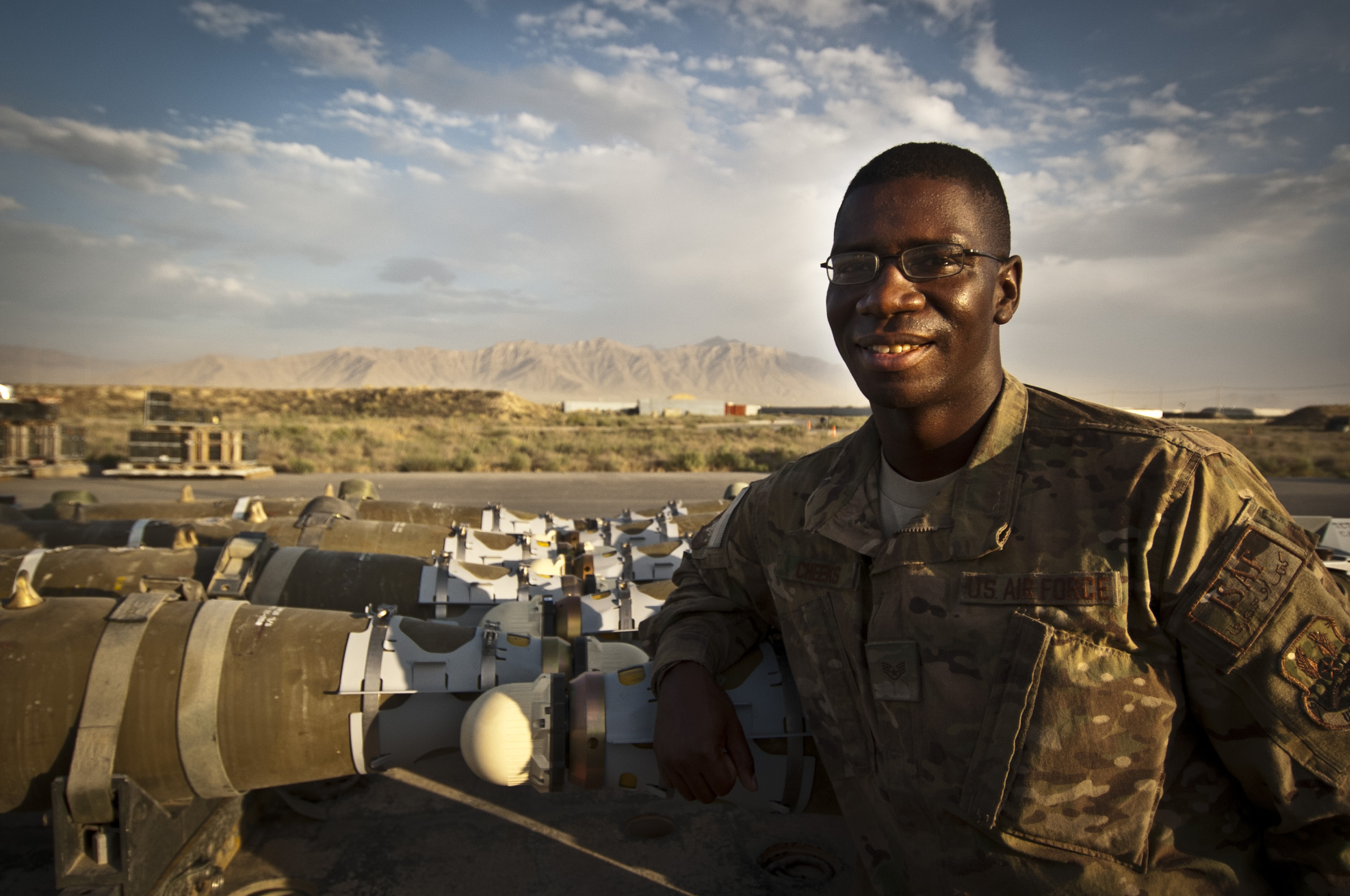 SSgt Bryan Cheeks, Munitions Systems Specialist with the 455th Maintenance Squadron, stands next to a shipment of GBU-38 smart bombs at Bagram Airfield, Afghanistan, June 23, 2012. Cheeks and his fellow maintainers sustain the fight by providing reliable, precise firepower to BAF’s aircrews. (U.S. Air Force photo/Capt. Raymond Geoffroy)