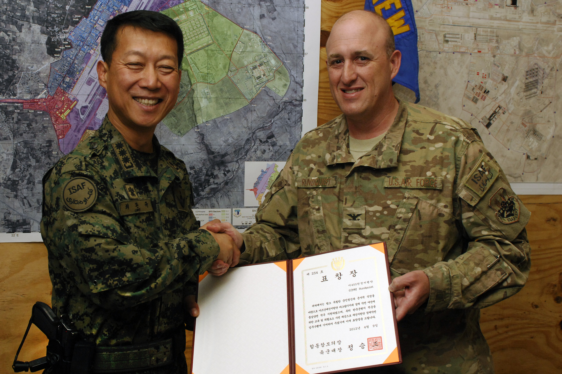 Col. Wankyu Choi, Republic of Korea Provincial Reconstruction Force commander, presents Col. Erik Rundquist, 455th Expeditionary Mission Support Group commander, with the ROK Joint Chiefs of Staff Certificate of Commendation at Bagram Airfield, Afghanistan June 24, 2012. Rundquist was presented the award on behalf of Gen. Jung Seung-jo, Chairman of the ROK JCS, for his group’s assistance in establishing the Korean Provincial Reconstruction Team in Sharikar Province. (U.S. Air Force photo/Staff Sgt. Jeff Nevison)