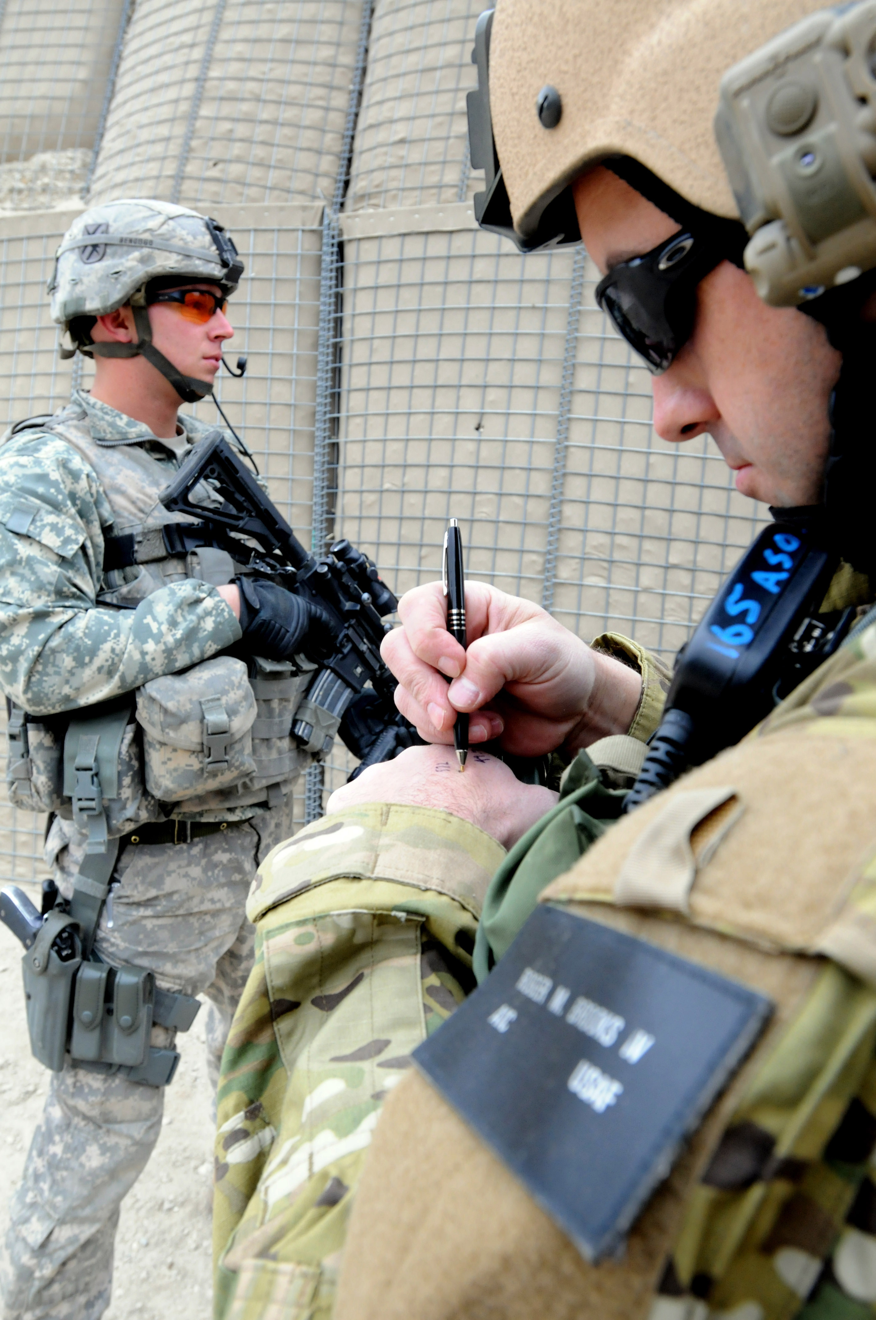 U.S. Air Force Capt. Roger M. Brooks IV, from Marietta, Ga., commander of a twelve-man Joint Terminal Attack Controllers team, takes note of mission air capabilities as U.S. Army Spc. Brett Bentley, Troop A, 1st Squadron, 108th Cavalry Regiment, provides security during a mission in the Achin District of eastern Afghanistan's Nangarhar province, Dec. 20. (U.S. Army Photo/Sgt. Tracy Smith)