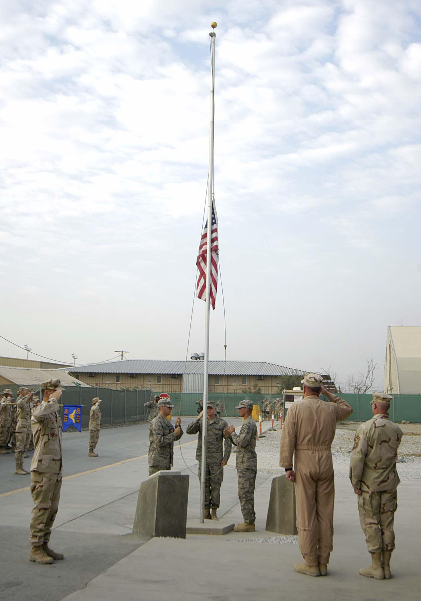 BAGRAM AIRFIELD, Afghanistan -- Airmen of the 455th Air Expeditionary Wing here salute the flag during a reveille ceremony marking the Air Force's 60th birthday, Sept. 18. The Wing provides a air mobility, aeromedical evacuation, intelligence, surveillance and reconnaissance and close air support to U.S. and Coalition forces throughout Afghanistan. (U.S. Air Force Photo by SSgt Mike Andriacco)