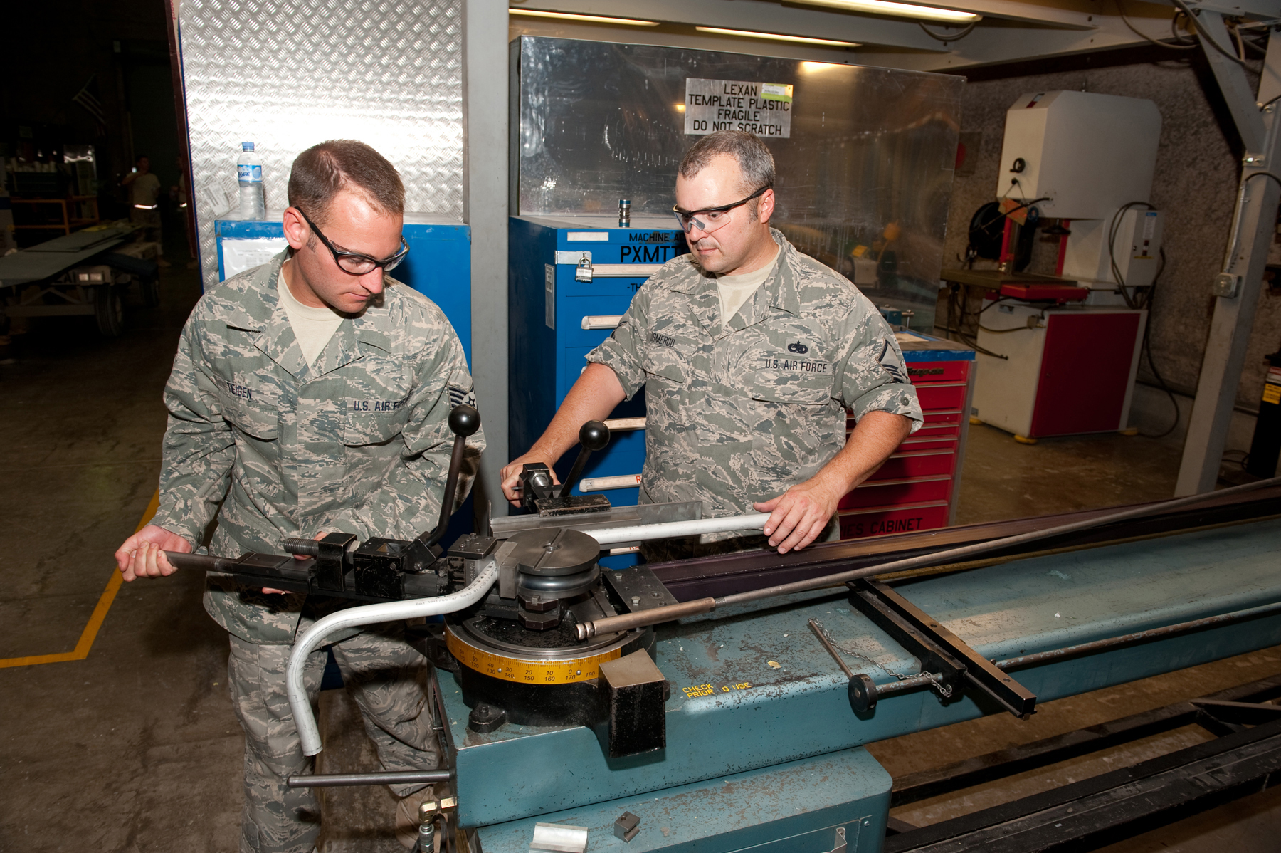 Left, Staff Sgt. Andrew Teigen and Master Sgt. Michael Ormerod, aircraft structural maintainers from the 379th Expeditionary Maintenance Squadron, bend tubing for aircraft hydraulic line use, July 27, in Southwest Asia. Sergeant Teigen is a native of Casselton, N.D. and deployed from the 119th Wing, North Dakota Air National Guard. Sergeant Ormerod is a native of Dallas, Texas and is deployed from the 161st Air Refueling Wing, Arizona Air National Guard. Both are serving in support of Operations Iraqi and Enduring Freedom. (U.S. Air Force Photo/Staff Sgt. Robert Barney)