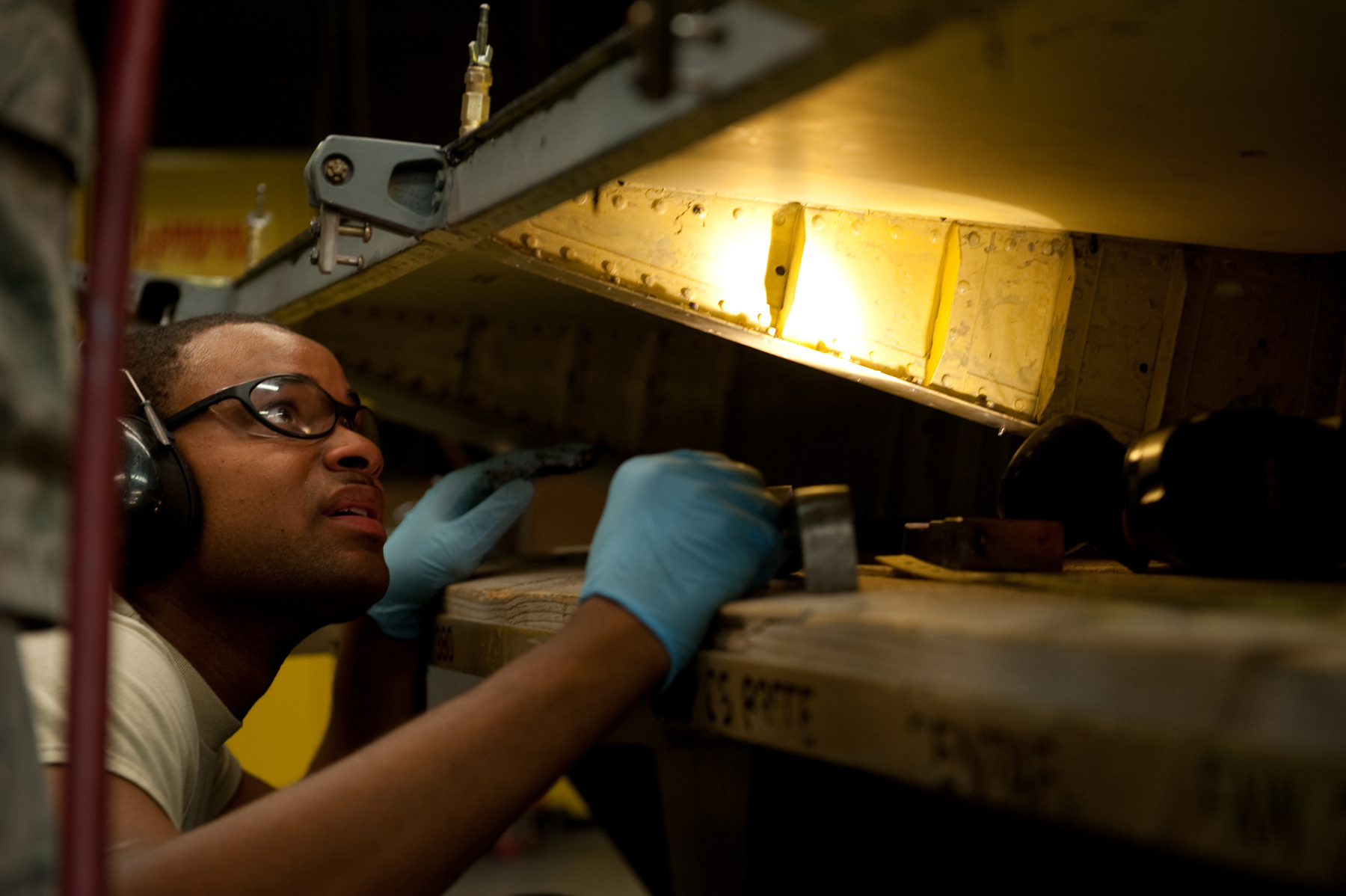 Senior Airman Christopher Jackson, 379th Expeditionary Maintenance Squadron aircraft structural maintainer, rivets a KC-135 Stratotanker aileron, July 27, in Southwest Asia. The 379 EMXS fabrication flight has the ability to construct or repair almost any avionic part, keeping the aircraft flying and maintaining mission readiness. Airman Jackson is a native of Marietta, Ga., and is deployed from Tinker Air Force Base, Okla., in support of Operations Iraqi and Enduring Freedom. (U.S. Air Force Photo/Staff Sgt. Robert Barney)
