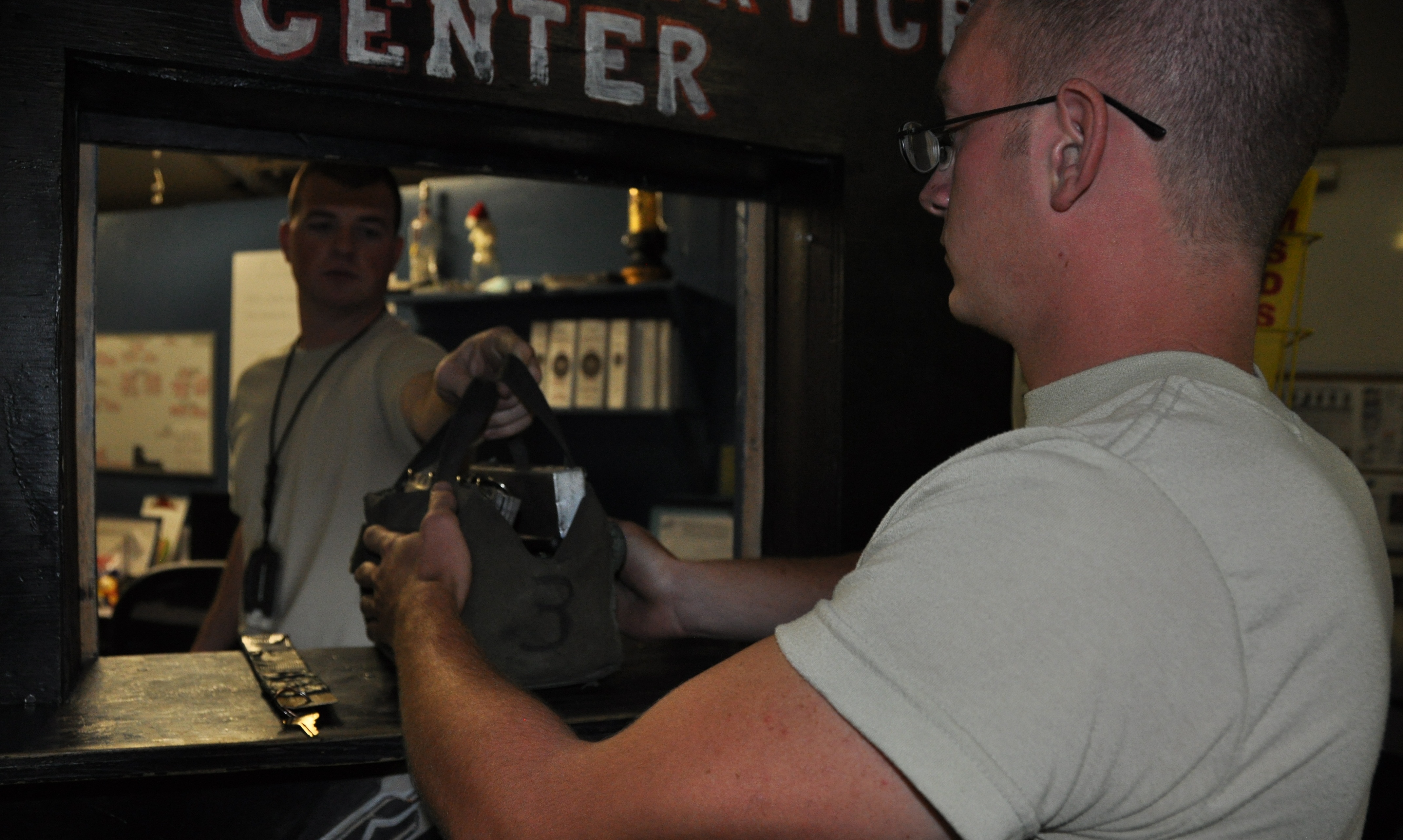 Senior Airman Robert Ellis, 455th Expeditionary Logistics Readiness Squadron refueling unit operator, deployed from Holloman Air Force Base, N.M., and a native of Gladstone, Mo., is issued a clipboard and checklist to take on a fuels run to refuel an aircraft from Staff Sgt. Jeffery Quinhoes, 455th ELRS fuels service center supervisor, deployed from Ellsworth AFB, S.D., and a native of Bernice, Okla., at Bagram Airfield, Afghanistan, Sept. 18, 2013. (U.S. Air Force photo/Tech. Sgt. Rob Hazelett)