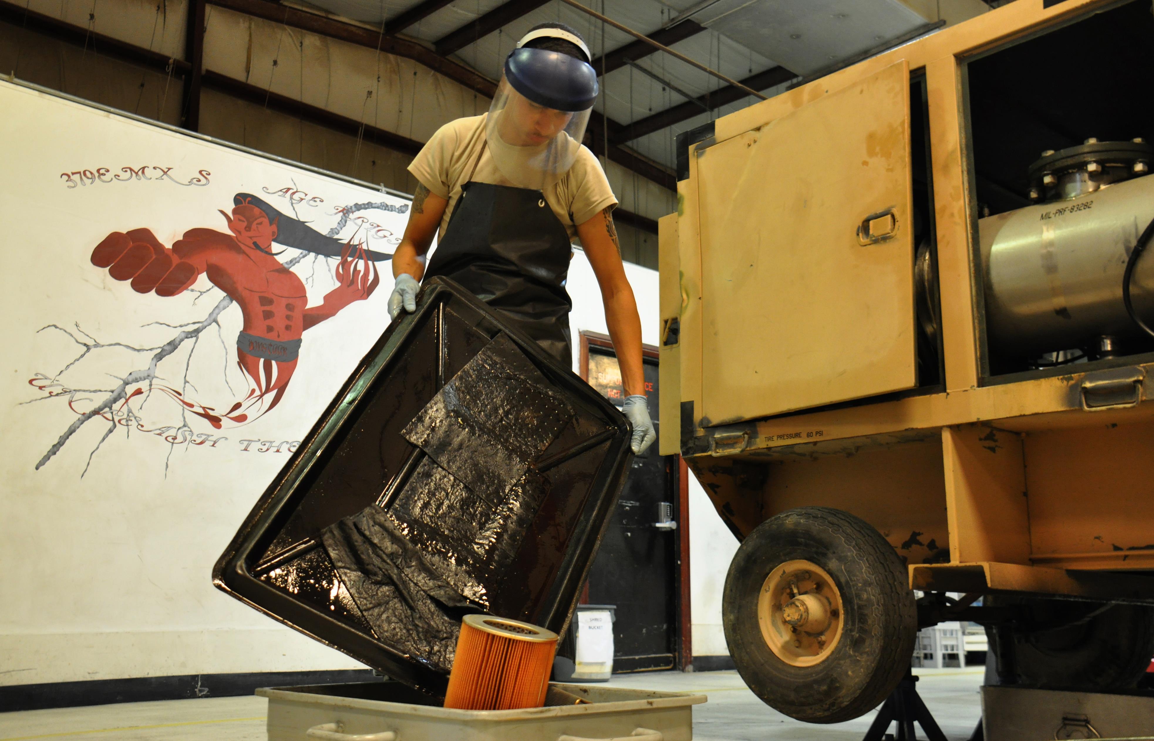Airman 1st Class Christopher Braine, 379th Expeditionary Maintenance Squadron Aerospace Ground Equipment mechanic, empties hydraulic fluid into a container inside the AGE flight facility at Al Udeid Air Base, Qatar, Feb. 4. Braine drained the fluid from a hydraulics-test stand during a routine maintenance check. The AGE Flight maintains more than 90 different types of equipment valued at $32 million. (U.S. Air Force photo by Tech. Sgt. James Hodgman/Released)